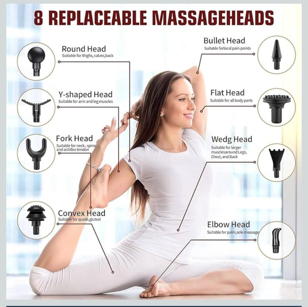8 replaceable massage heads including Round, Bullet, Y-shaped, Flat, Fork, Wedge, Convex, and Elbow heads for every muscle group.